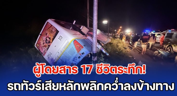 ผู้โดยสาร 17 ชีวิตระทึก! รถทัวร์นครราชสีมา – ชัยภูมิ เสียหลักพลิกคว่ำลงข้างทาง