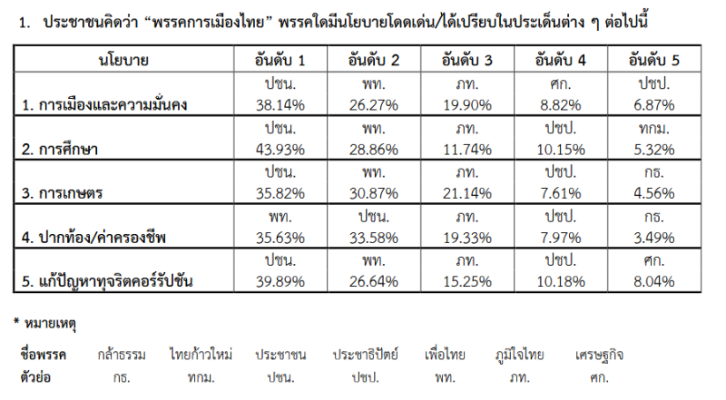 1. ประชาชนคิดว่า พรรคการเมืองไทย พรรคใดมีนโยบายโดดเด่น/ได้เปรียบในประเด็นต่าง ๆ ต่อไปนี้